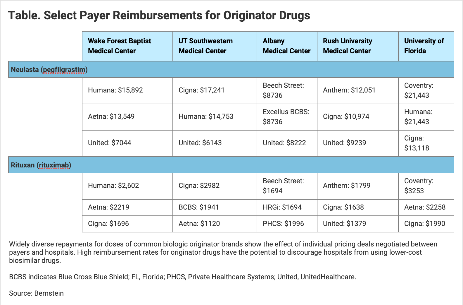 For example, UT Southwestern Medical Center receives $17,241 from Cigna for administering a dose of the Neulasta originator brand of pegfilgrastim, whereas Aetna pays UT Southwestern $6474 per dose. Humana pays Wake Forest Baptist Medical Center $4370 for a dose of the Prolia originator brand of denosumab, whereas United Healthcare pays Wake Forest $2209, according to the Bernstein report. As these data show, because compensation levels can sometimes be high, 30% to 43% of hospitals only carry the innovator products, Okon said (Table).