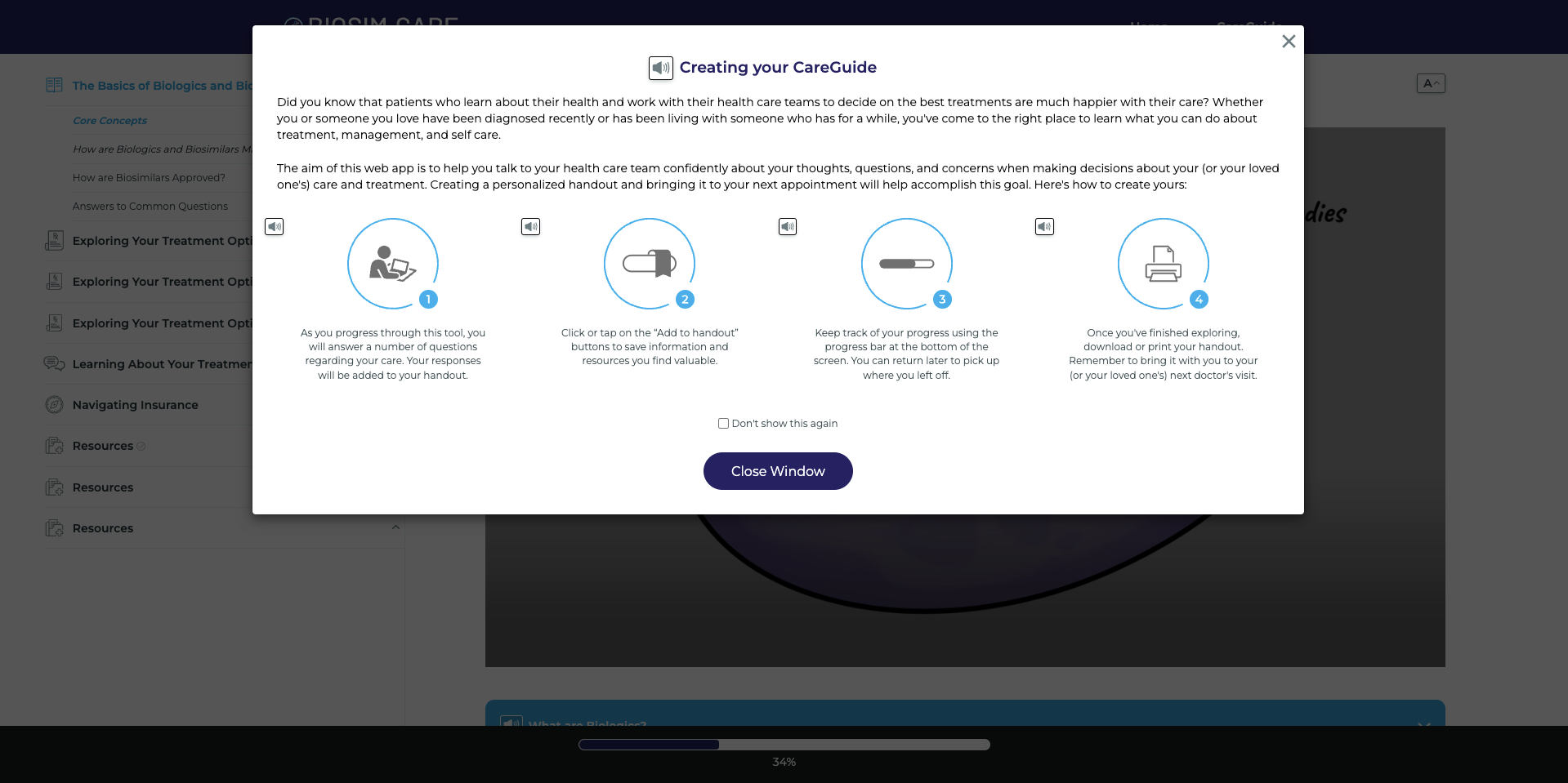 The Biosim.care platform allows users to create their own CareGuide, in which modules can be saved for review. The platform is free to use and offers information for both patients/caregivers and providers.