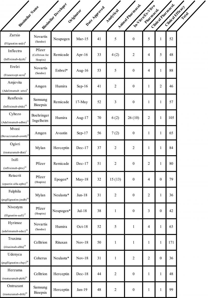 First, I will provide a broad summary of the scope and redundancies in the regulatory submissions from 8 companies among the 28 approvals. Not including the most recent applications for the pegfilgrastim biosimilar Nyvepria and adalumumab biosimilar Hulio (for which the FDA has not yet posted the Biologics License Application [BLA] details) there were over 1100 analytical similarity, 96 animal pharmacology, 42 in-vitro/ex-vitro pharmacology, 52 clinical pharmacology, and 32 clinical efficacy studies conducted. Here are the highlights of the compiled data: