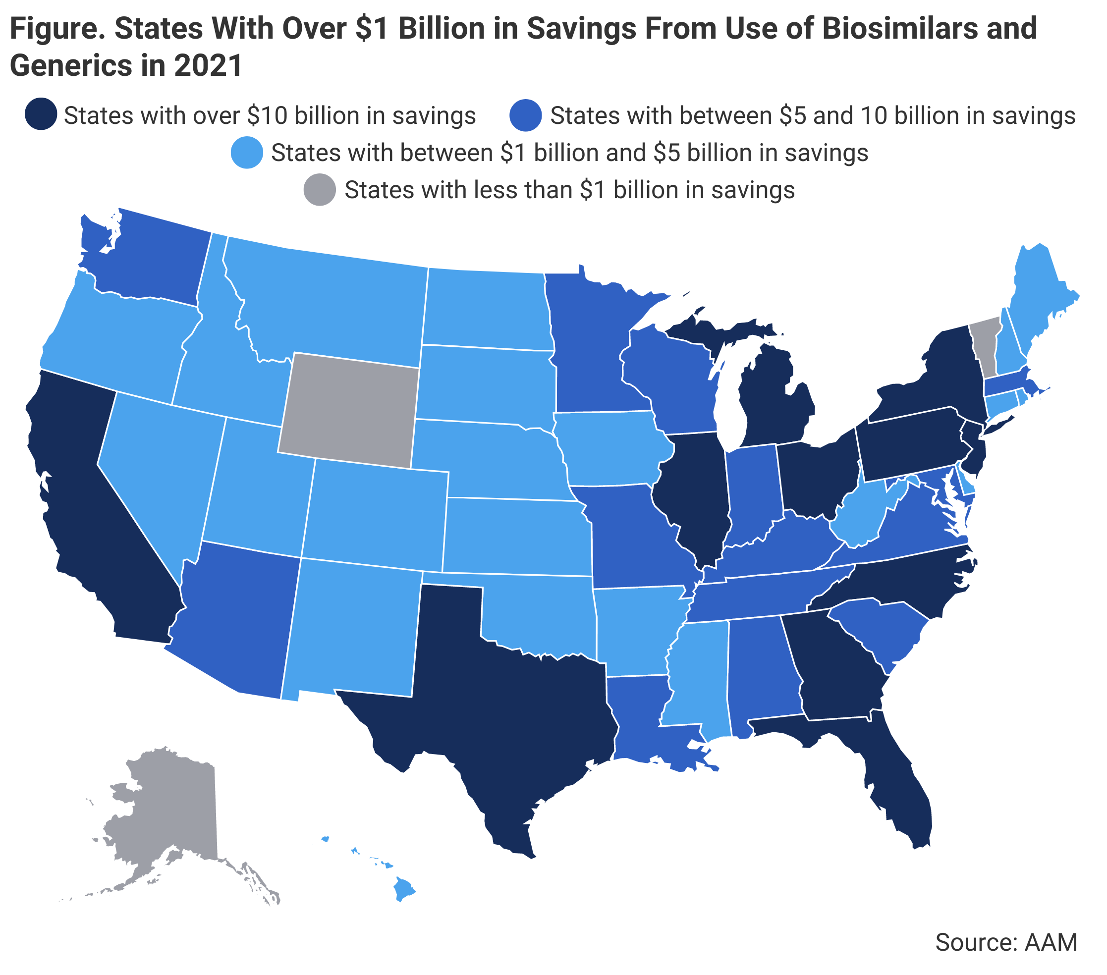 A map of the United States showing the states that have saved over $10 billion or had a high per capita savings from using generic or biosimilar drugs in 2021.
