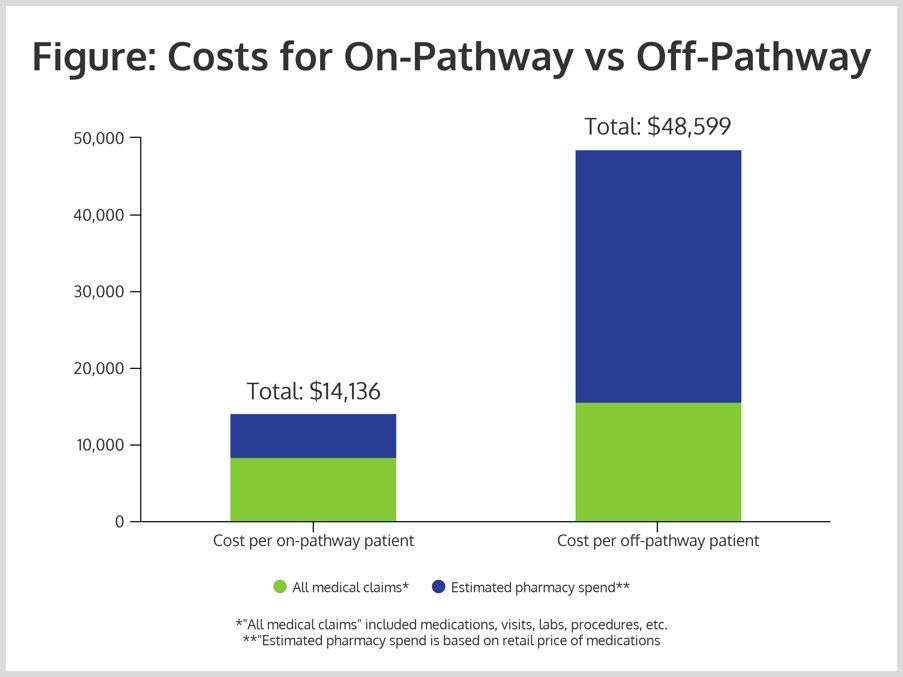 That compares with significantly higher costs for the off-pathway patients: $15,564 for all medical claims, $33,035 for pharmacy costs; and $48,599 in total (Figure). This represented a savings of 70%.