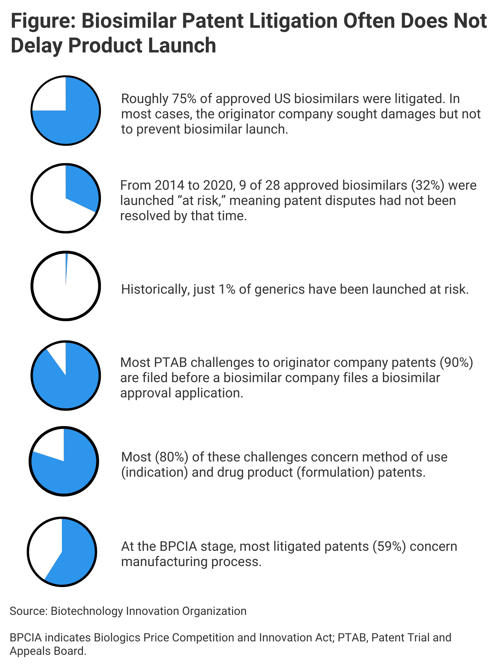 Two members of the Biotechnology Innovation Organization (BIO), a large trade group of pharmaceutical companies, argue that this is not the case. Basing their arguments in part on recent research into biosimilar litigation, Hans Sauer, deputy general counsel, and Melissa Brand, former assistant general counsel for Intellectual Property, contend that patents in general are not holding up biosimilar competition (Figure).