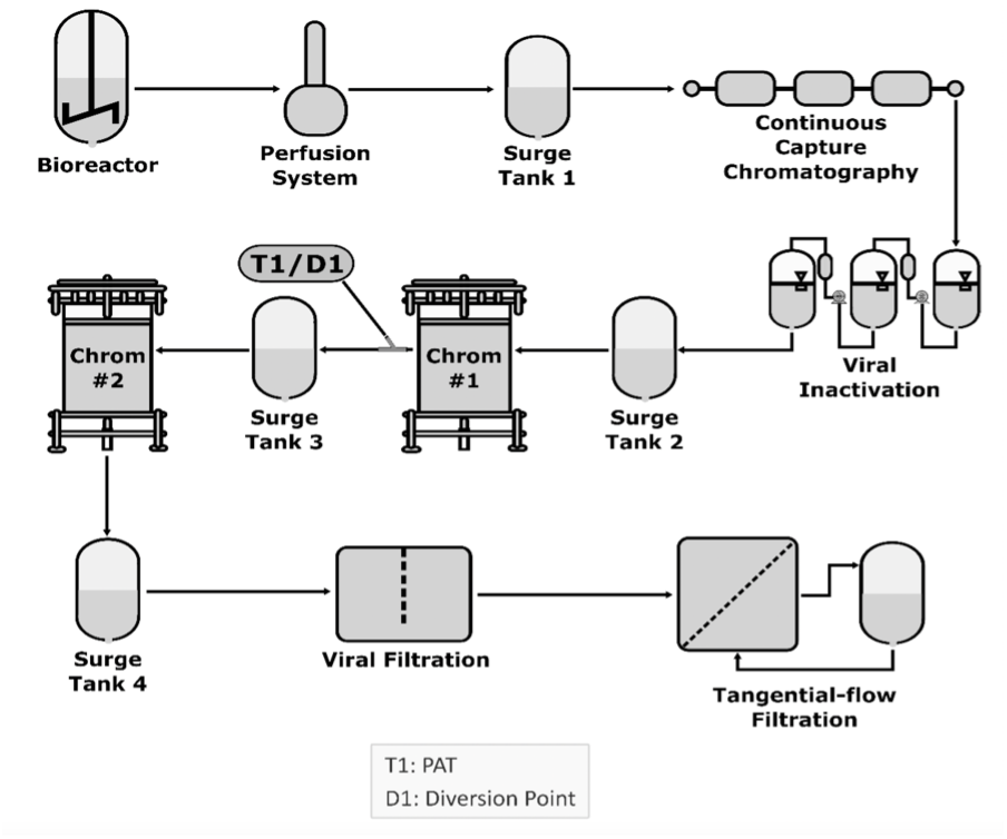 Continuous manufacturing applies to any unit operation, such as a bioreactor, capture chromatography, virus filtration, virus inactivation, buffer exchange, and concentration through tangential flow chromatography. Each unit operation is integrated with adjacent unit operations, a surge line, or a tank connecting unit operations.