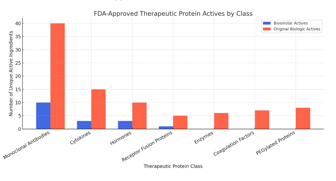 While biosimilars encompass a range of biologics—including cytokines, hormones, and fusion proteins—monoclonal antibodies dominate FDA approvals due to market size, technological readiness, and regulatory clarity. Other biologic types will likely increase biosimilar representation as more patents expire, regulatory pathways evolve, and analytical and manufacturing technologies advance.