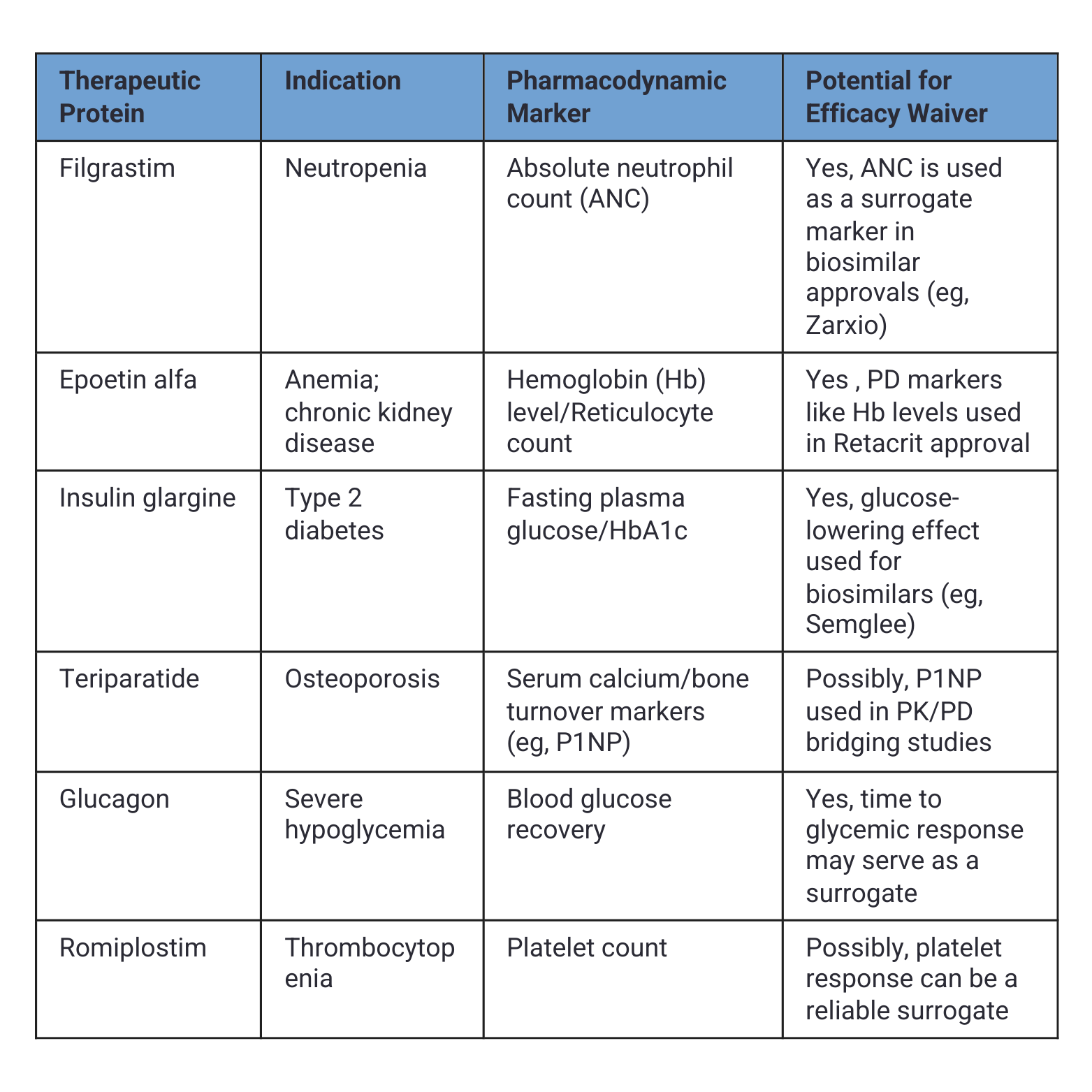 However, the developers need to consider a significant shift in the regulatory pathways for biologics other than monoclonal antibodies. Here is a table of therapeutic proteins that demonstrate measurable pharmacodynamic (PD) parameters, which in some cases have supported waivers of efficacy trials during biosimilar development. These PD markers serve as reliable surrogates to demonstrate comparable clinical activity. One perplexing example is that darbepoetin, with a market worth over $8 billion, has no biosimilar. I anticipate the FDA to enable efficacy waivers for all biosimilars soon, just as the UK’s Medicines and Healthcare products Regulatory Agency has done, and EMA is expected within the next few weeks. However, the language of waivers will not state it; it will follow the guidelines that the FDA has issued for interchangeable status. It will be up to the developers to request such a waiver and argue why it is unnecessary.