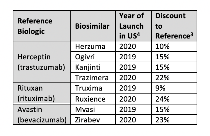 Oncology biosimilars are the most recent market entries. There are biosimilars available for trastuzumab (Herceptin), rituximab (Rituxan), and bevacizumab (Avastin). The discount levels for oncology biosimilars range from approximately 10% to 25%.3