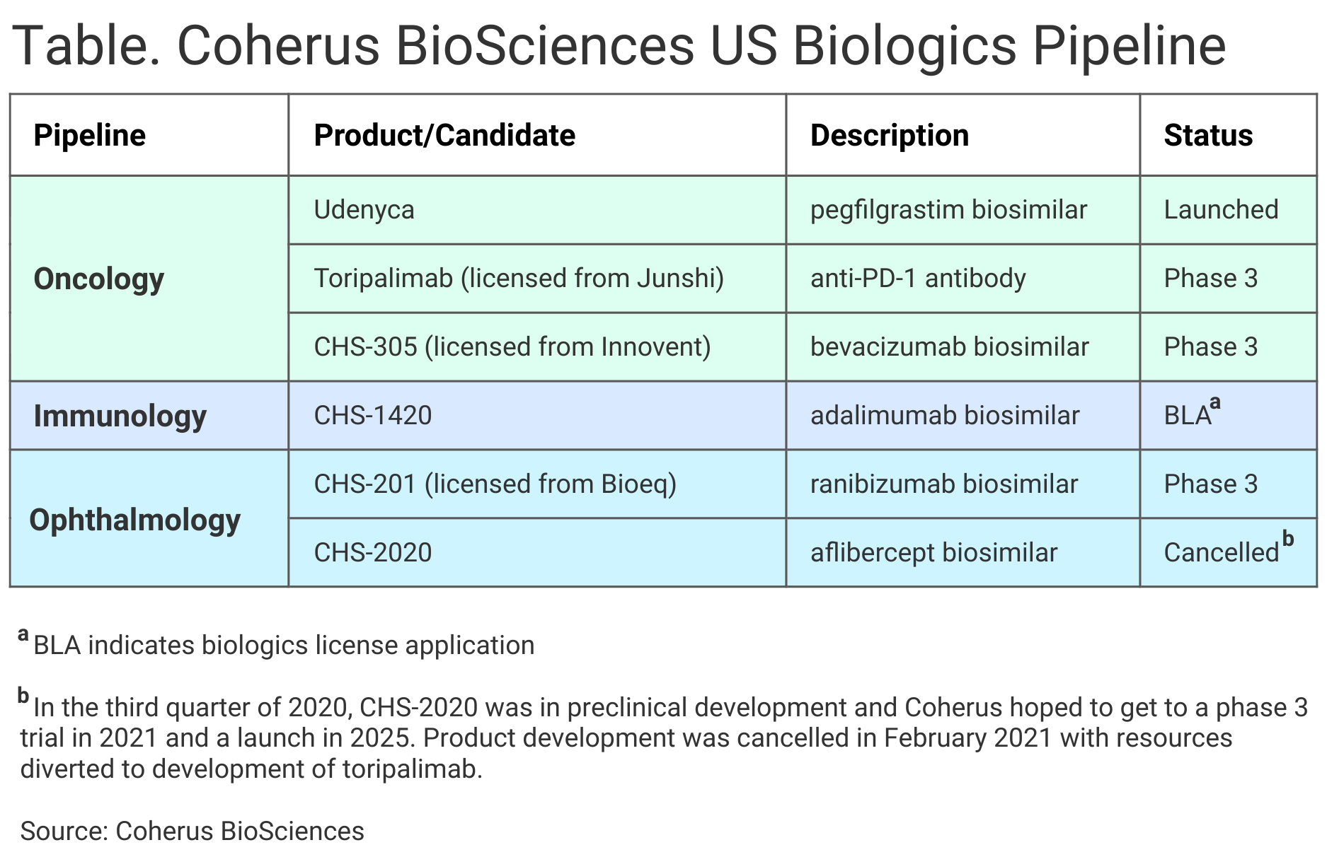 Coherus reported a net loss of $173 million for the quarter, mainly because of a $145 million payment to Junshi Biosciences for the US and Canada marketing rights to toripalimab and charges associated with the recent cancellation of plans to bring an aflibercept ophthalmology biosimilar candidate (CHS-2020) to market. The product would have referenced Eylea.