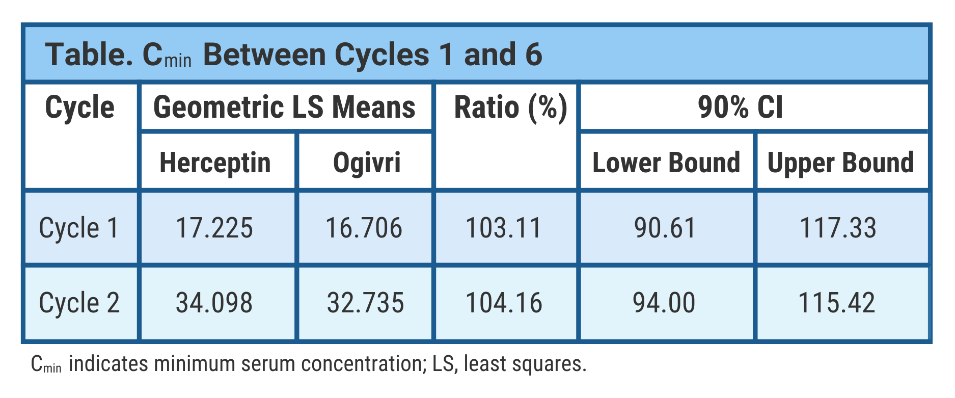 In the trough concentration (lowest drug concentration before the next dose) analysis, data were comparable between treatment arms at the end of cycles 1 and 6, the investigators said (Table).