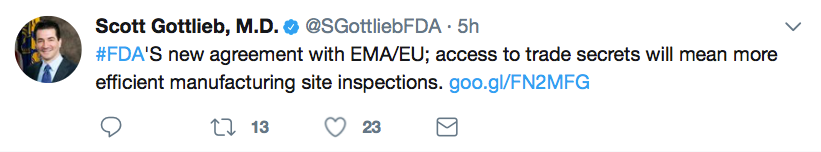 FDA commissioner, Scott Gottlieb, MD, took to Twitter to hail the aggreement, saying that it would lead to more efficient manufacturing site inspections: