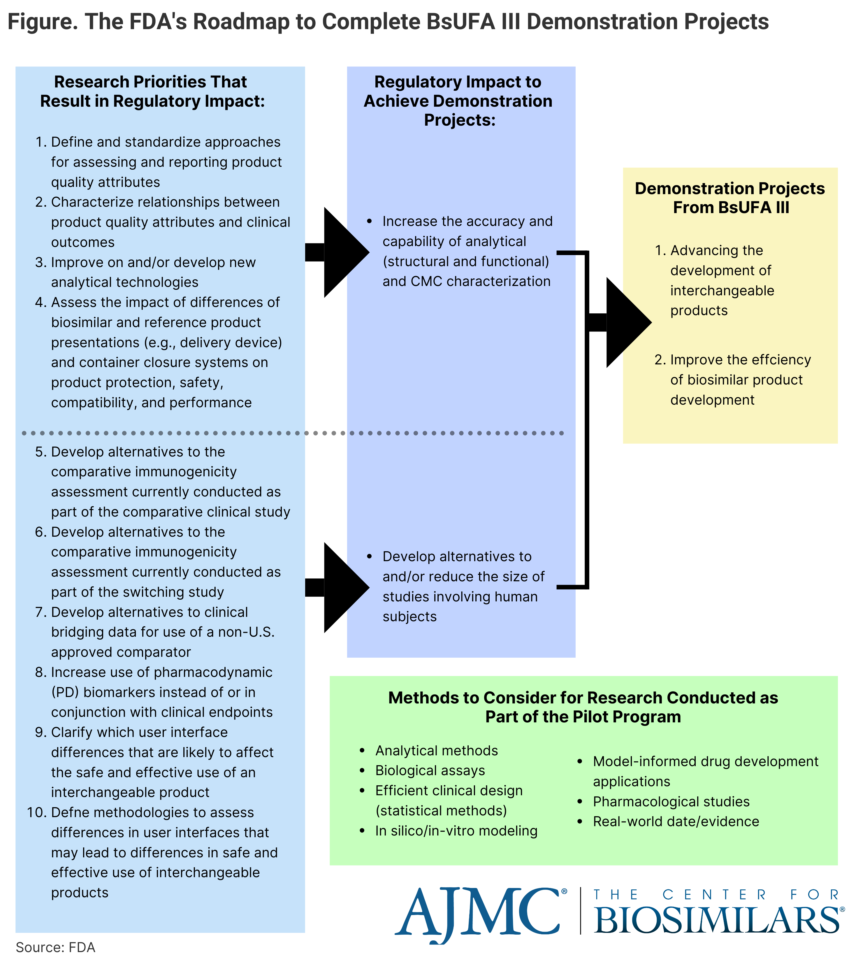 BsUFA III (2023-2027) builds on the first 2 authorizations by having the FDA take extra steps to ensure efficient governance and operations across the biosimilar product review programs. As part of the new authorization, the FDA penned a commitment letter establishing the regulatory science research program as a means of identifying knowledge gaps and researching ways to advance biosimilar development. The program features 2 demonstration projects: