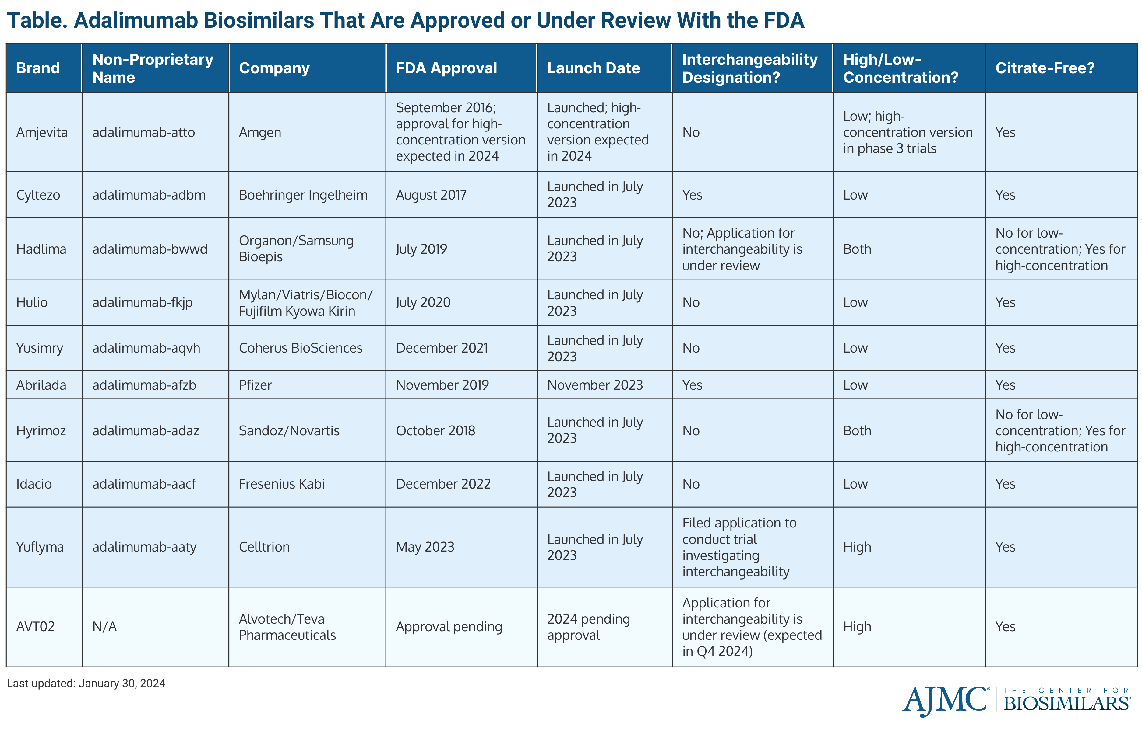 The first product to launch was Amgen’s Amgevita (adalimumab-atto) at the end of January 2023. The citrate-free product was originally approved in September 2016, and a high-concentration version is expected to be approved in 2024. (Table)