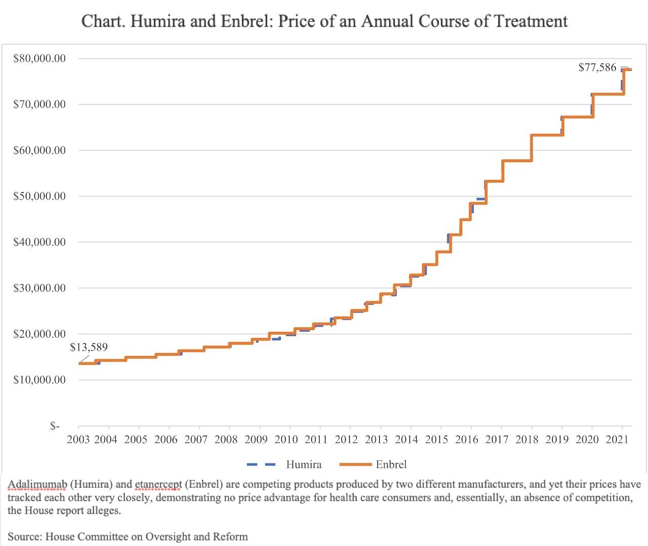 From 2003 to 2021, the prices of Humira and Enbrel mirrored each other almost exactly throughout dozens of price increases, according to the report (Chart).