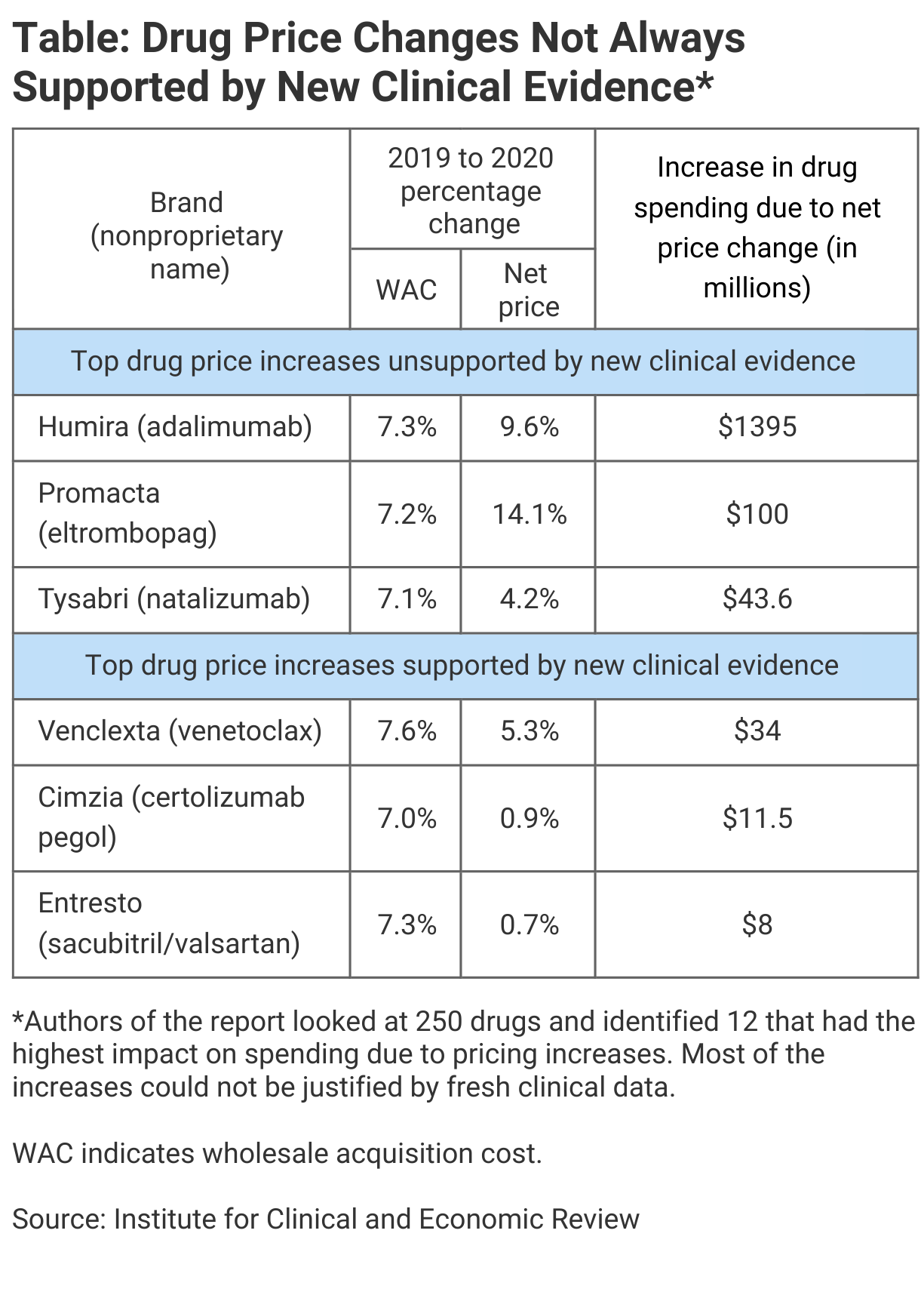 For the report, ICER studied the top 12 drugs (out of a basket of 250) in the United States whose prices had the greatest impact on national drug spending and sought to evaluate whether new clinical evidence was presented from 2019 to 2020 that might have justified the price increases seen.