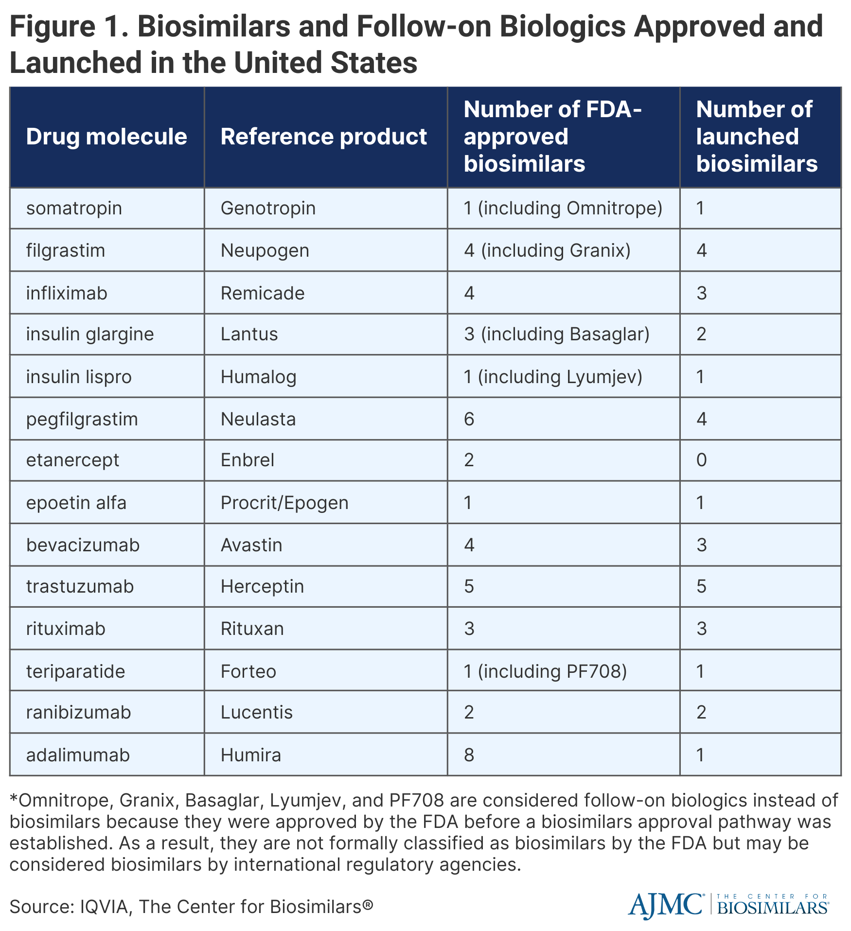 There are currently 40 official FDA-approved biosimilars as well as 5 FDA-approved follow-on biologics, which were approved before the establishment of a biosimilars approval pathway and thus, are not considered biosimilars in the United States but are classified as biosimilars in international markets. Of these 45 products, 31 have launched in the United States (Figure 1).