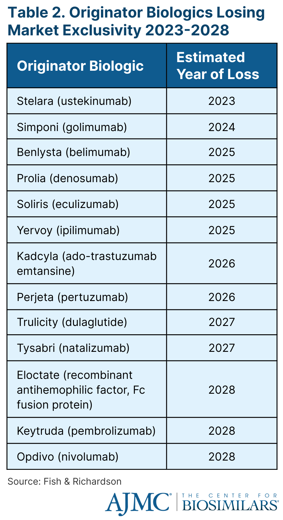Shmuel highlighted the 13 big originator biologics that will lose exclusivity over the next 5 years (Table 2), including Stelara (ustekinumab), which is expected to face biosimilar competition starting in late 2023 or early 2024.