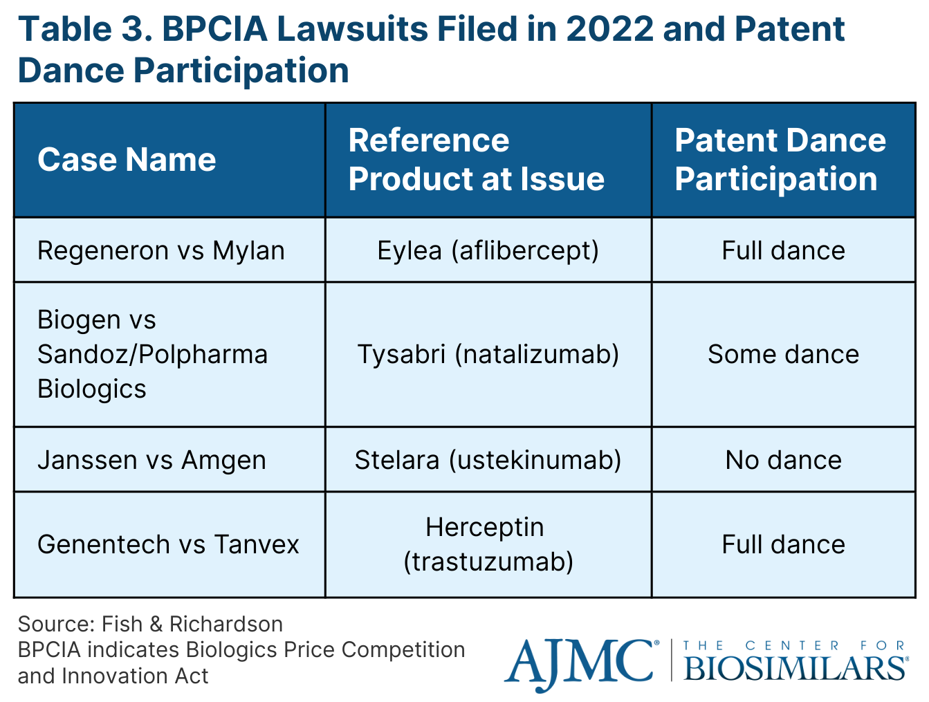 The cases ranged in how much the parties took part in the patent dance, a multistep process within the Biologics Price Competition and Innovation Act (BPCIA) that allows for both the originator company and the biosimilar company to exchange information relevant to the patents on the reference product that might be infringed by marketing of the proposed biosimilar.