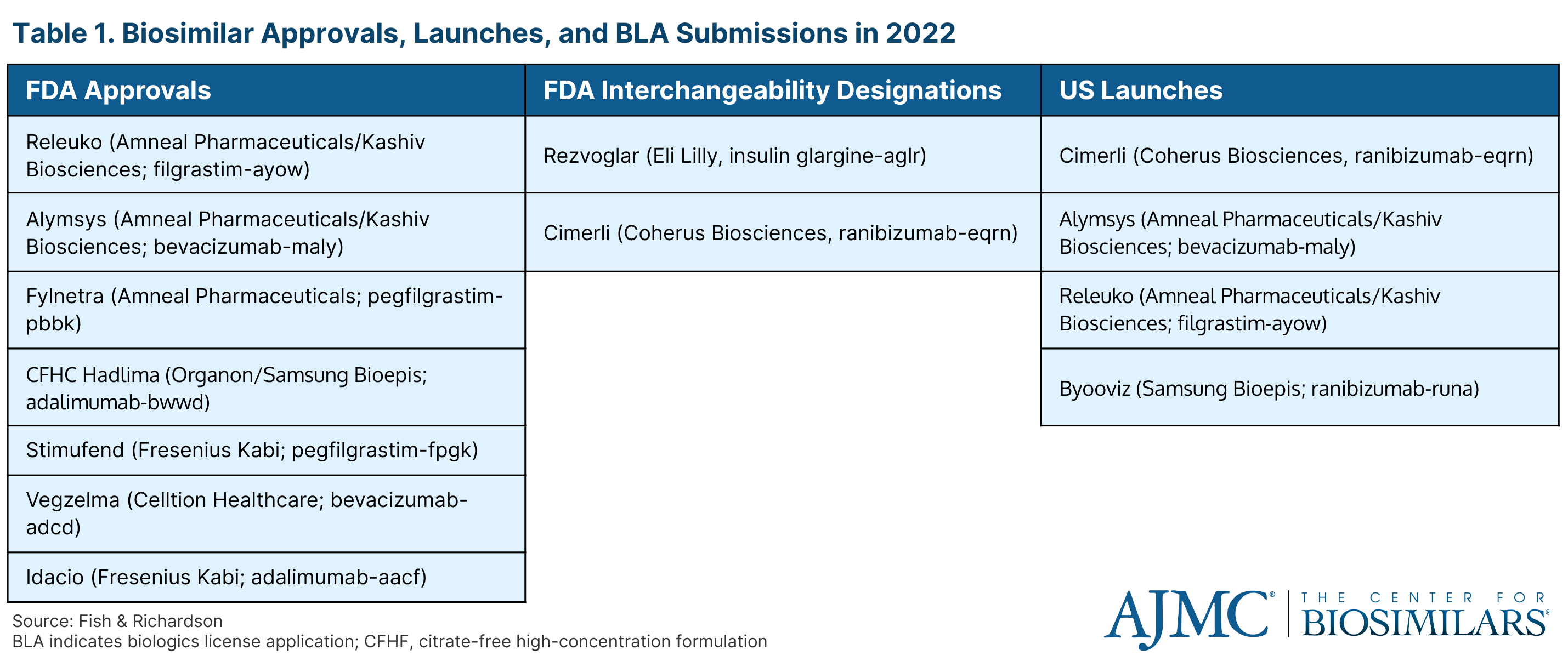 Jenny Shmuel, JD, principal at Fish & Richardson, provided an overlook of the FDA approvals and US launches in the biosimilars space. During 2022, there were 7 approvals, including 1 for a high-concentration version of an adalimumab biosmilar (Hadlima; Organon/Samsung Bioepis), 4 launches, and 2 interchangeability designations (Table 1). Additionally, there were 11 biologics license application (BLA) submissions for biosimilars.