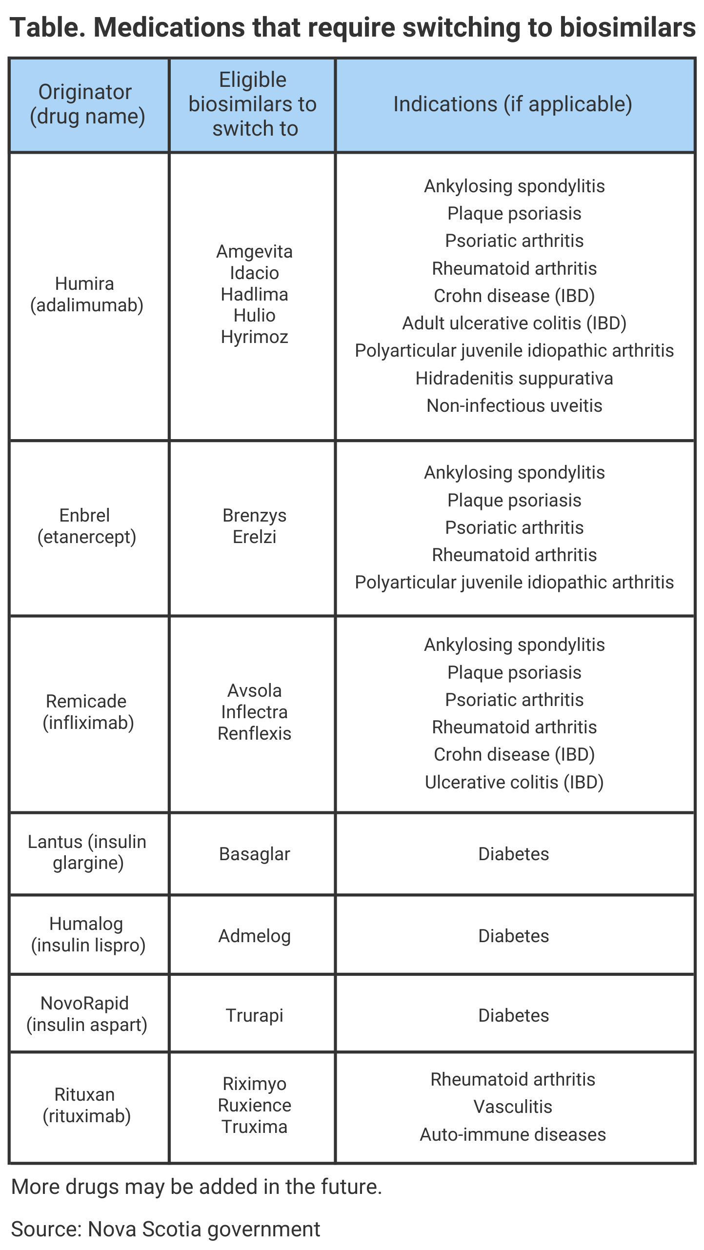 About 5100 patients who have health coverage with the Nova Scotia Pharmacare Programs treated with certain expensive reference biologic drugs to treat arthritis, diabetes, inflammatory bowel disease (IBD), or psoriasis will be switch to a biosimilar version of the medicine within the next 12 months, specifically by February 3, 2023.