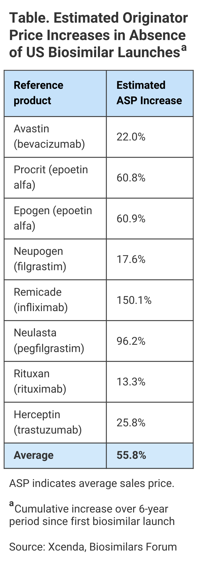 Biosimilars hold much promise in keeping prices steady for therapies across complex disease states. In fact, new research from Xcenda shows that biosimilars not only cost less, but the competition they create in the market helps to drive down the cost of the biologics they reference. Without biosimilars, 8 brand name biologics (reference products) were on track to see average sales price (ASP) increases of 56% over the 6-year period ending April 2021, according to this report (Table).