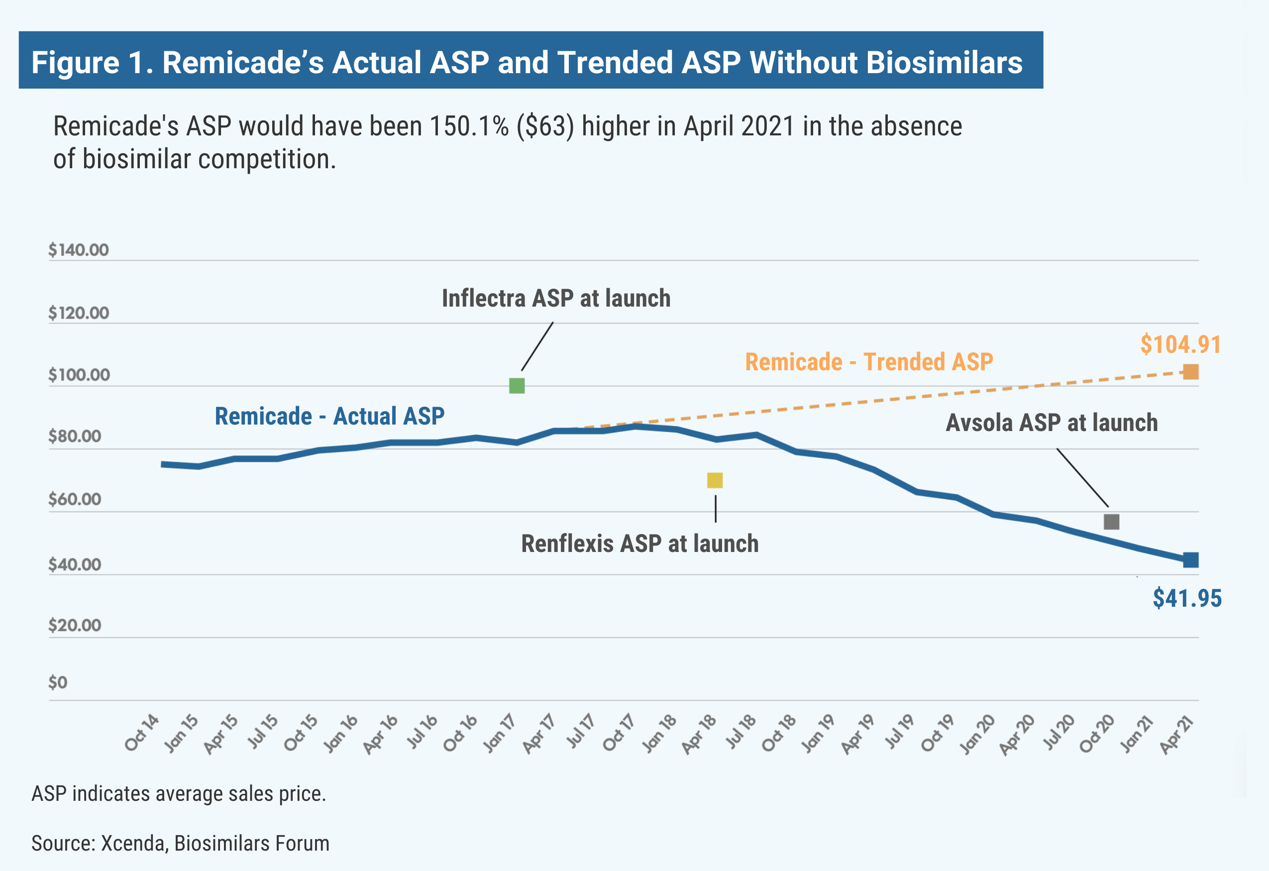Remicade (infliximab) is used as an autoimmune treatment for arthritis (rheumatoid arthritis, arthritis of the spine, psoriatic arthritis), certain bowel diseases (Crohn disease, ulcerative colitis), and a specific severe skin disease (chronic plaque psoriasis). The medicine reduces symptoms and can induce and maintain remission of these chronic diseases, improving quality of life. Without the launch of the infliximab biosimilars Inflectra, Renflexis, and Avsola, Remicade’s estimated ASP would be 150% higher, research shows (Figure 1).