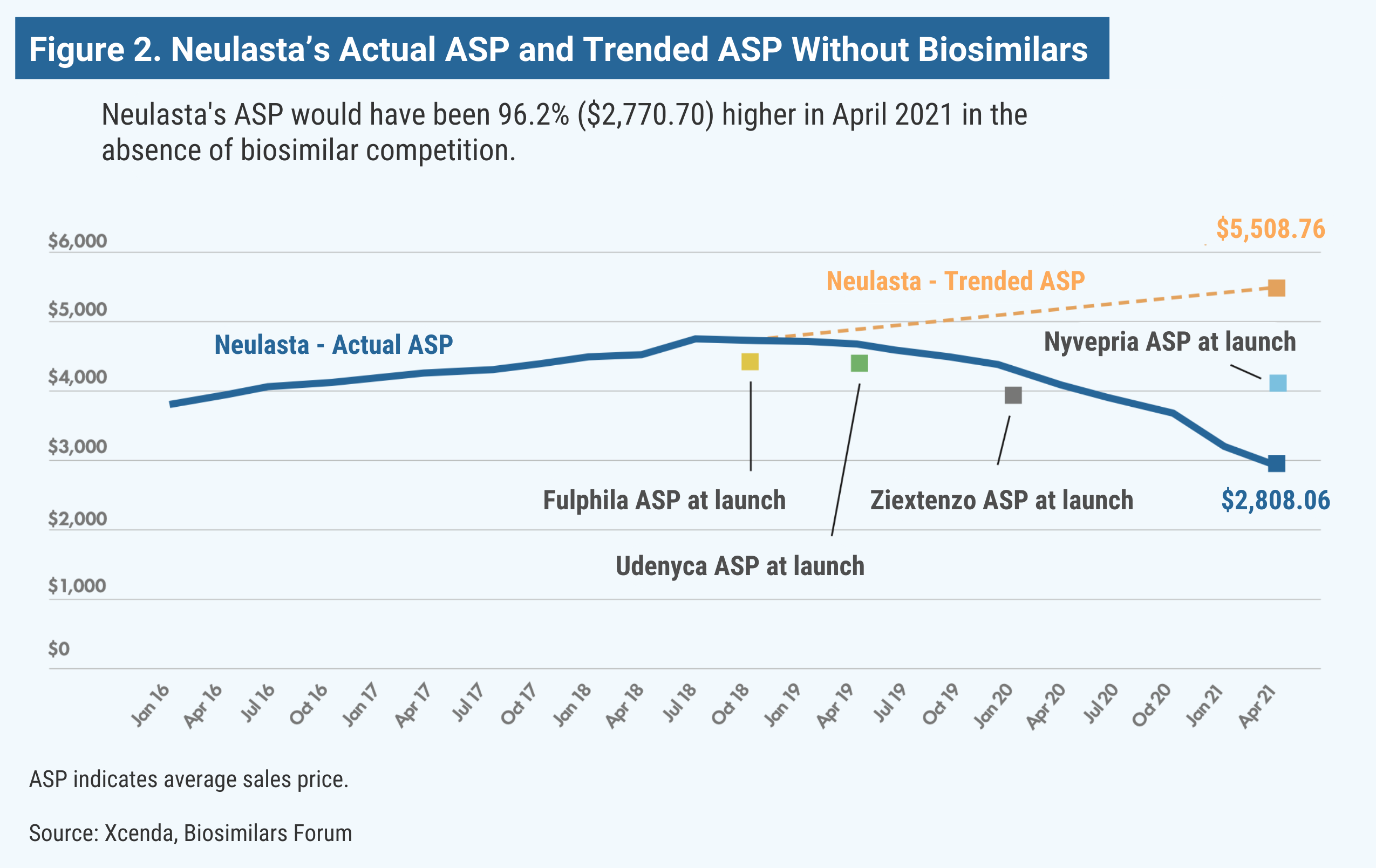 Neulasta (pegfilgrastim) is used in oncology support to help the body replenish white blood cells after receiving chemotherapy. Although chemotherapy works by killing cancer cells, it can decrease the number of white blood cells in the body and lower the immune system, potentially causing febrile neutropenia (FN). Based on a study of patient data from 2007 to 2010, more than 80% of US patients with FN require hospitalization. Pegfilgrastim can boost white blood cells and, in turn, change the lives of many patients. Without the launch of pegfilgrastim biosimilars Fulphila, Udenyca, Ziextenzo, and Nyvepria, Neulasta’s price would be almost double (Figure 2).