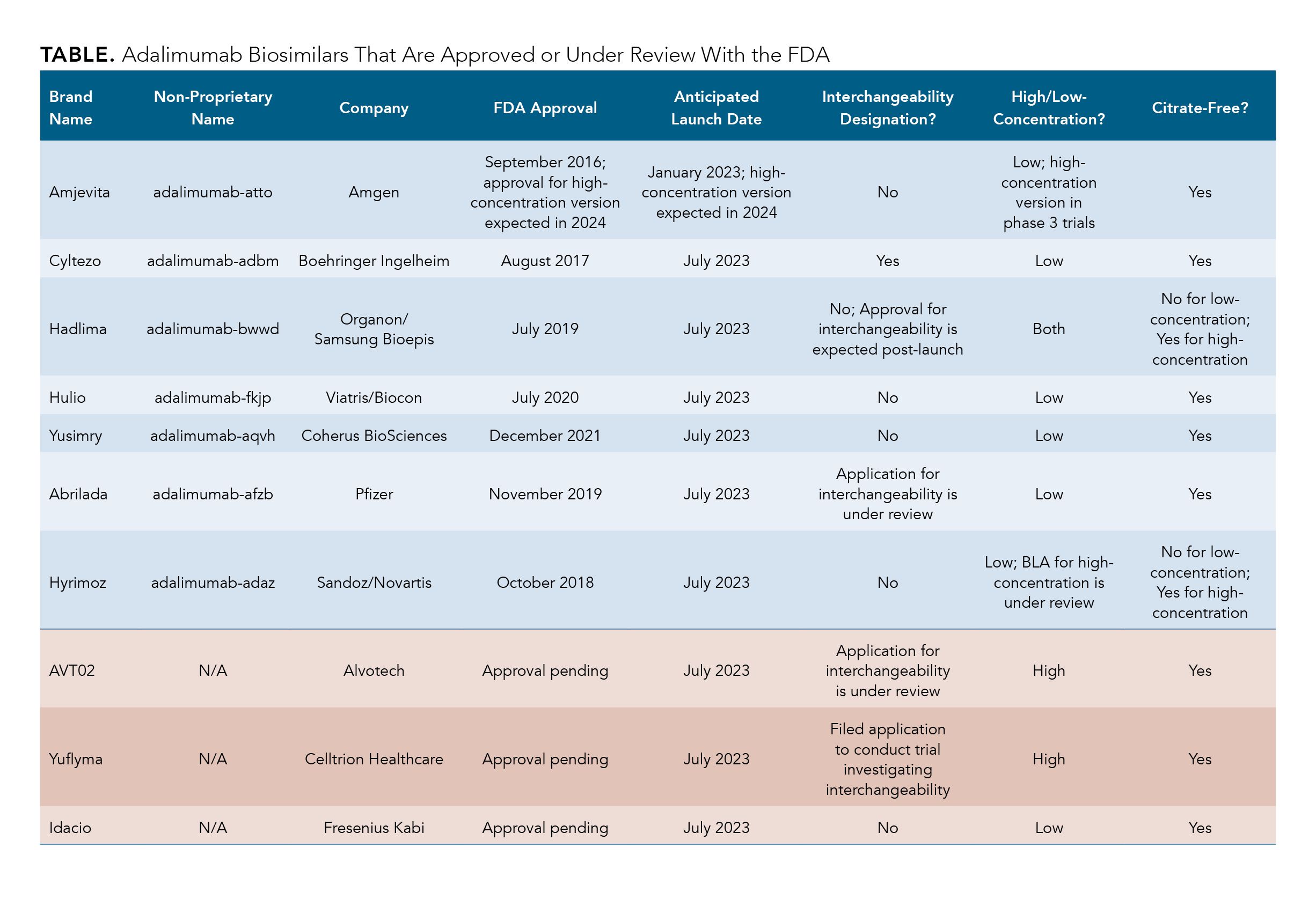 Currently, biologics license applications (BLAs) for FDA approval are under review for 3 biosimilars. Additionally, the FDA is reviewing BLAs for high-concentration versions of 1 biosimilars that have already been approved in a low-concentration formulation. (See below for a discussion of the differences between high- and low-concentration formulations.)