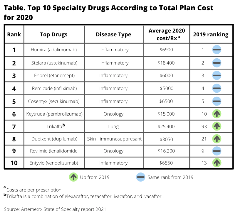 In terms of 2020 specialty drug spending, the following categories of drugs were at the top of the list (Table):