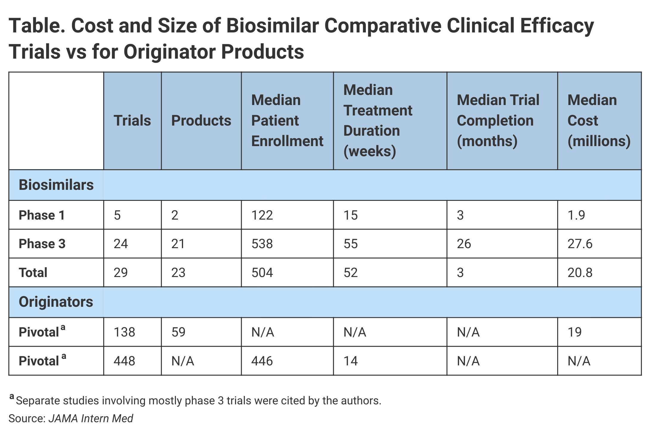 A study of comparative clinical efficacy trials for biosimilars, often considered unnecessary, suggests that these trials are often larger and as rigorous as those done for originator products, and often are more costly than for new molecular entities.