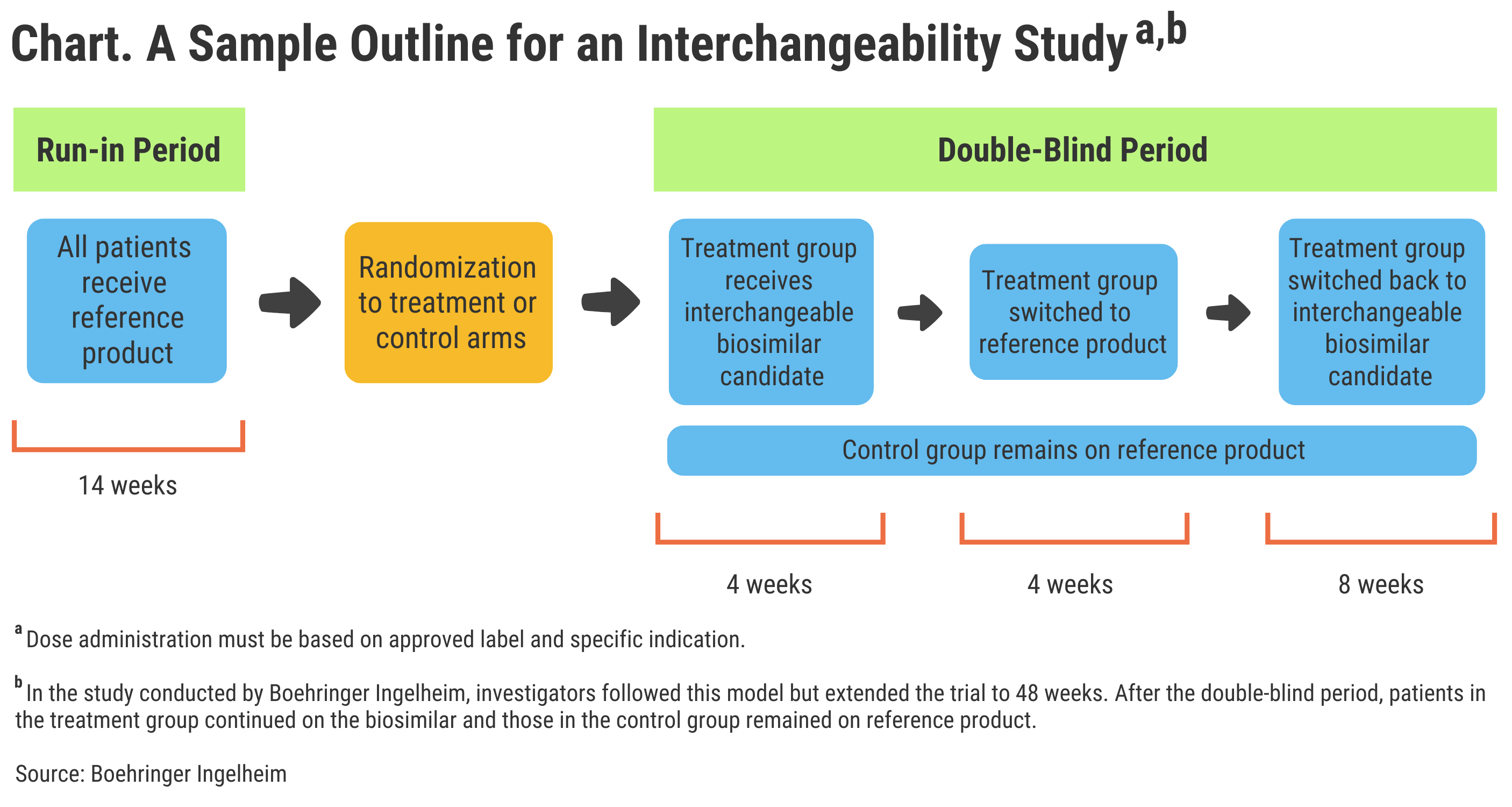 So, what does it take for a biosimilar to be approved as interchangeable in the United States? To have its adalimumab biosimilar considered interchangeable to just the 40-mg/0.8-mL formulation of the reference product (Humira), Boehringer Ingelheim had to do a separate study that involved patients switching multiple times from reference drug to biosimilar and back again (Chart).