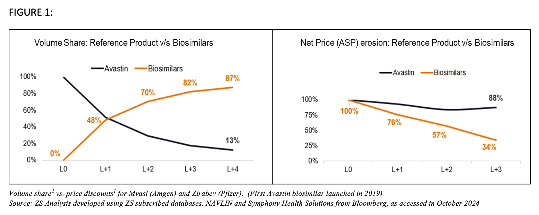 Fortunately, due to the net prices that were offered, biosimilars picked up adoption (see Figure above). On the other hand, Roche diverted its efforts against biosimilar entry. The company didn’t focus on net prices (~10% decline year over year [YoY])1 compared to biosimilar drops (~20% decline YoY)1. This, along with its promotional efforts toward its next-generation products, contributed to a rapid volume erosion for the blockbuster triad (Herceptin/trastuzumab, Rituximab/rituximab, and Avastin/bevacizumab).