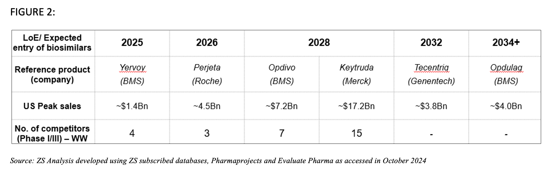 The oncology landscape is now expecting another wave of biosimilar competition, with several established biologics nearing patent expiry. The market opportunity is expected to reach about $25 billion by 2029.8,9 Frontrunners include Yervoy (ipilimumab) and Perjeta (pertuzumab), which are both crucial blockbusters in various oncology indications such as non-small cell lung cancer and metastatic breast cancer. Additionally, checkpoint inhibitors such as pembrolizumab (Keytruda) and nivolumab (Opdivo) are set to join the list with their respective biosimilars expected in 2028.3