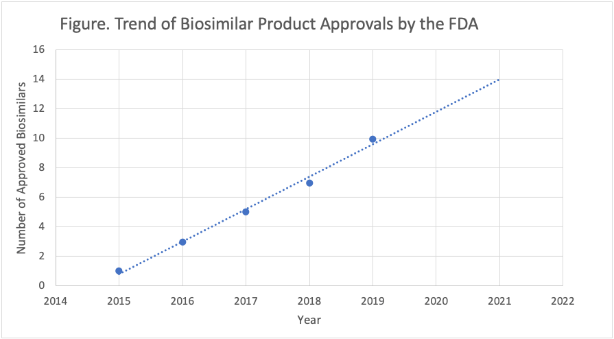 In previous years, biosimilar approvals had steadily increased. As shown in the figure, the projected trend suggested approximately 12 biosimilar approvals for 2020 and 14 for 2021.