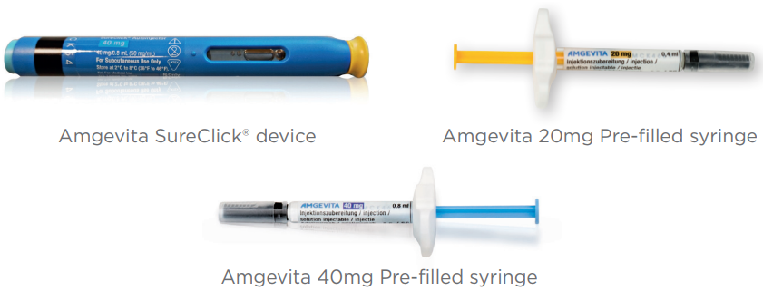 The EU's Amgevita and the US' Amjevita can be administered using a prefilled syringe (20 mg or 40 mg doses) or an auto-injector pen (SureClick device). Source: Amgen