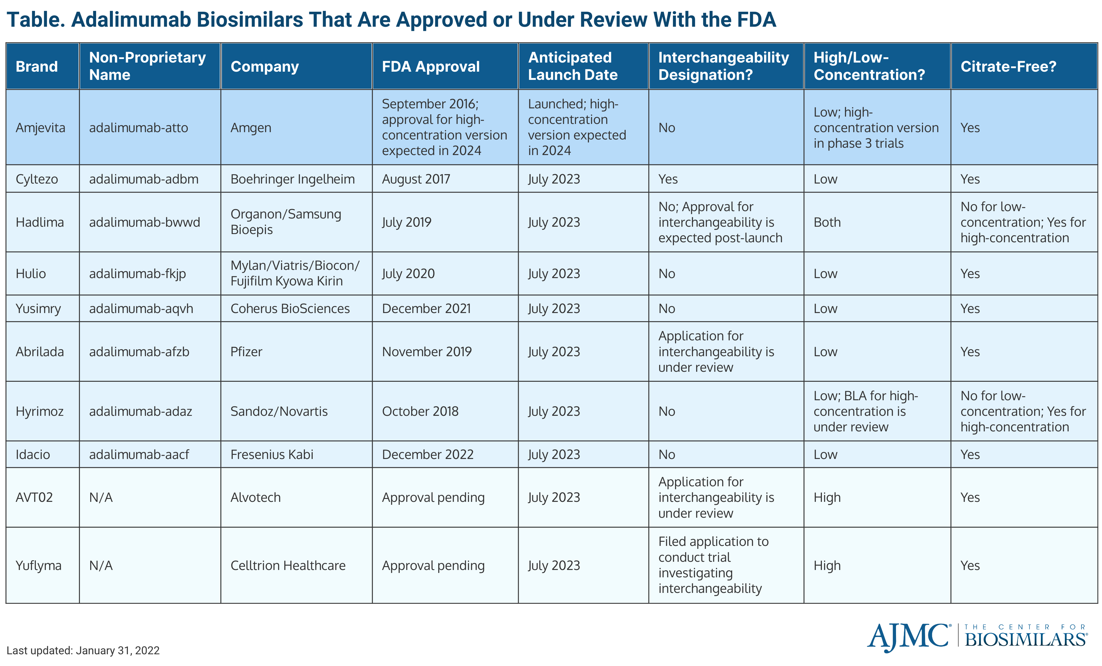 The biosimilar is 1 of 10 adalimumab biosimilars expected to launch in 2023 and it will be the only adalimumab product competing against the originator until July 2023 (Table). There are currently 8 FDA-approved biosimilars and 2 others are under review. Amjevita will be offered in a prefilled syringe and an auto-injector pen.