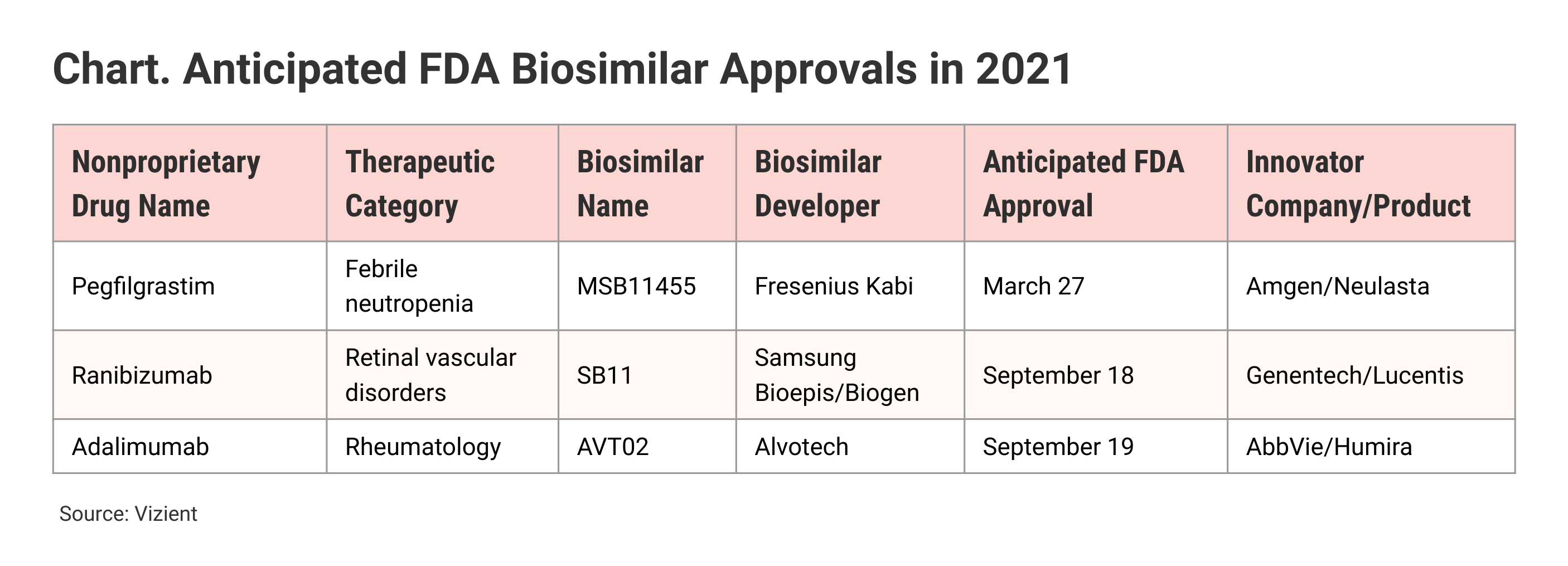 Vizient is anticipating FDA approval of individual biosimilar products in 2021 for pegfilgrastim (referencing Neulasta), ranibizumab (Lucentis), and adalimumab (Chart). Biologics license applications for each of these products were filed in 2020.