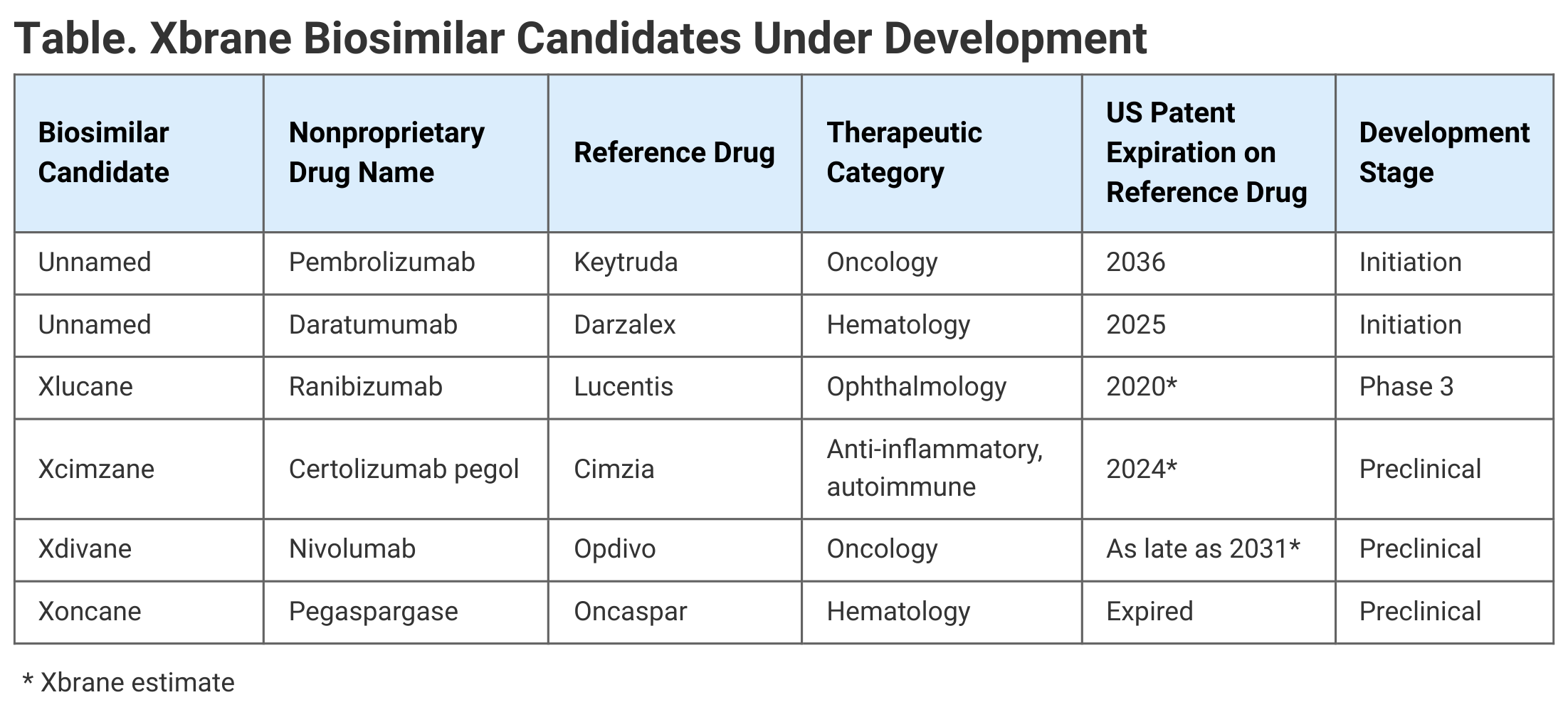 Xbrane has other biosimilars in development, though none on the market currently. These include Xlucane (ranibizumab), which references the blockbuster ophthalmology drug Lucentis for wet age-related macular degeneration, diabetic-related macular edema, and retinal vein occlusion. This biosimilar candidate is in phase 3 development.
